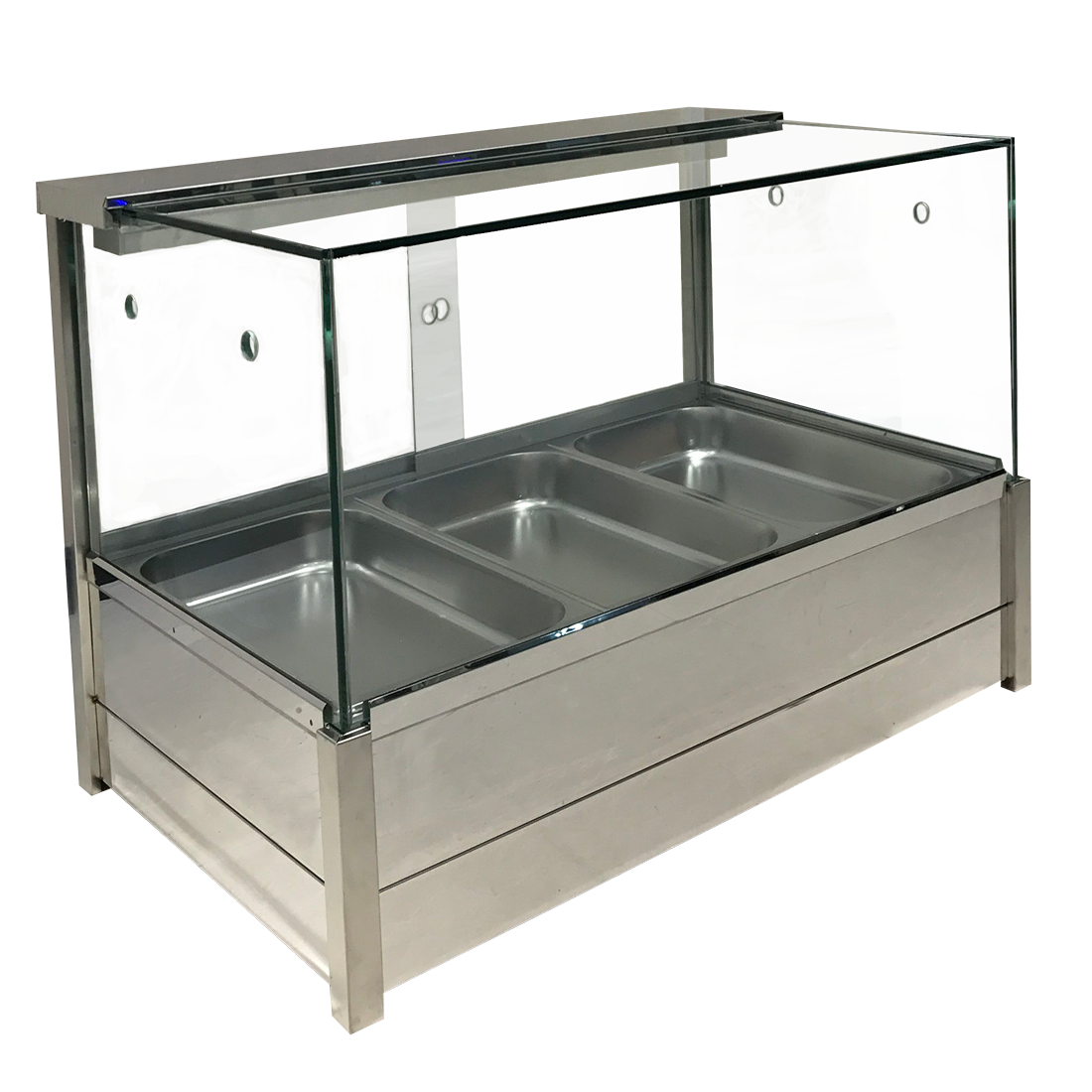 This heated and premium bain marie is constructed with a strong stainless steel make, ideal for restaurants or takeaway stores serving from a range of ingredients and requiring a slow cooking process. It also come with pan dividers, Italian-made heating elements, toughened glass with optimal viewing capacity of your culinary craft, sliding rear doors, overhead heating lamps, safety lock valve drains and a streamlined interior for easy cleaning.